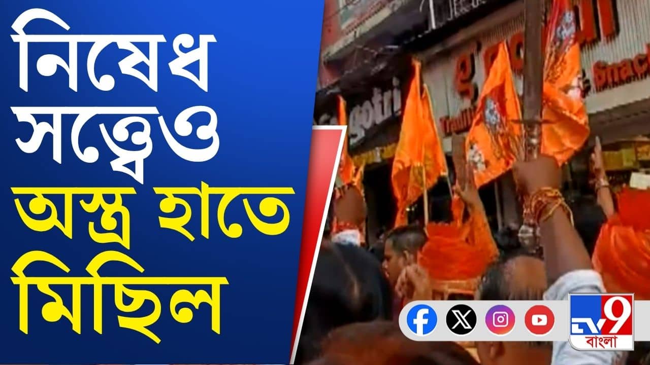 হাইকোর্টের নির্দেশই সার। অস্ত্র নিয়ে রামনবমীর মিছিল হাওড়ায়। মিছিল করলেন আবার তৃণমূল প্রার্থী গৌতম চৌধুরী। আজ দুপুরে গোলমোহরের কাছ থেকে মিছিল বের করে হাওড়া খটিক সমাজ। অস্ত্র পুজোর পর বর্ণাঢ্য শোভাযাত্রায় অস্ত্র এবং ডিজে বাজতে দেখা যায়। এই মিছিল উপলক্ষে কড়া পুলিশি নিরাপত্তার বন্দোবস্ত করা হয়। এই মিছিলে অংশ নেয় কয়েক হাজার মানুষ। মিছিলে পা মেলাতে দেখা যায় উত্তর হাওড়ার তৃণমূলের বিদায়ী বিধায়ক গৌতম চৌধুরীকে। সংগঠনের সভাপতি বিবেক সোনকার জানান, রামনবমীর মিছিলে অস্ত্র হাতে নেওয়া এটা তাঁদের ধর্মীয় রীতি। পুলিশের অনুমতি থাকল কি না সেটা গুরুত্বপূর্ণ নয়। এ ব্যাপারে আদালত যদি জানতে চায় তাহলে আদালতকে তাঁরা জানাতে প্রস্তুত। তবে রাজনীতির সঙ্গে এই অস্ত্র মিছিলের কোনও সম্পর্ক নেই।