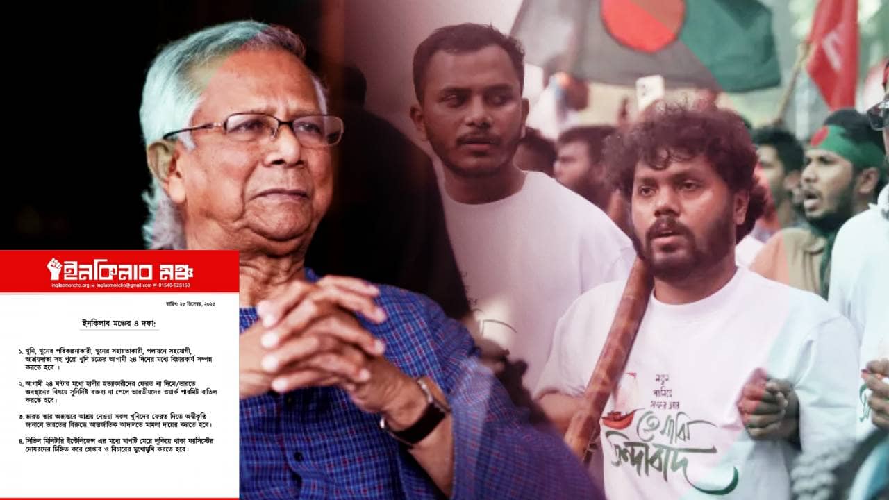 তৃতীয় দাবিতে ভারতের বিরুদ্ধে পদক্ষেপ নেওয়ার আর্জি জানিয়েছে ইনকিলাব মঞ্চ। অন্তর্বর্তী সরকারের প্রধান উপদেষ্টা মুহাম্মদ ইউনূসের কাছে ইনকিলাব মঞ্চের আবেদন, বাংলাদেশের প্রাক্তন প্রধানমন্ত্রী শেখ হাসিনা এবং আওয়ামী লিগের নেতা-কর্মীরা যারা নয়াদিল্লিতে ‘আশ্রয় নিয়েছেন’, তাঁদেরকে যদি ফেরত না দেওয়া হয়, তা হলে আন্তর্জাতিক আদালতে ভারতের বিরুদ্ধে মামলা করতে হবে। পাশাপাশি, চতুর্থ দাবি হিসাবে বাংলাদেশের গোয়েন্দা সংস্থা এবং সেনার অন্দরে থাকা হাসিনা-পন্থীদের চিহ্নিত করে তাঁদের বিরুদ্ধে আইনি পদক্ষেপের দাবি জানিয়েছে হাদির সংগঠন। এই প্রতিটি দাবি পূরণের জন্য ইউনূস সরকারকে ২৪ দিনের সময়সীমা দিয়েছে ইনকিলাব মঞ্চ।