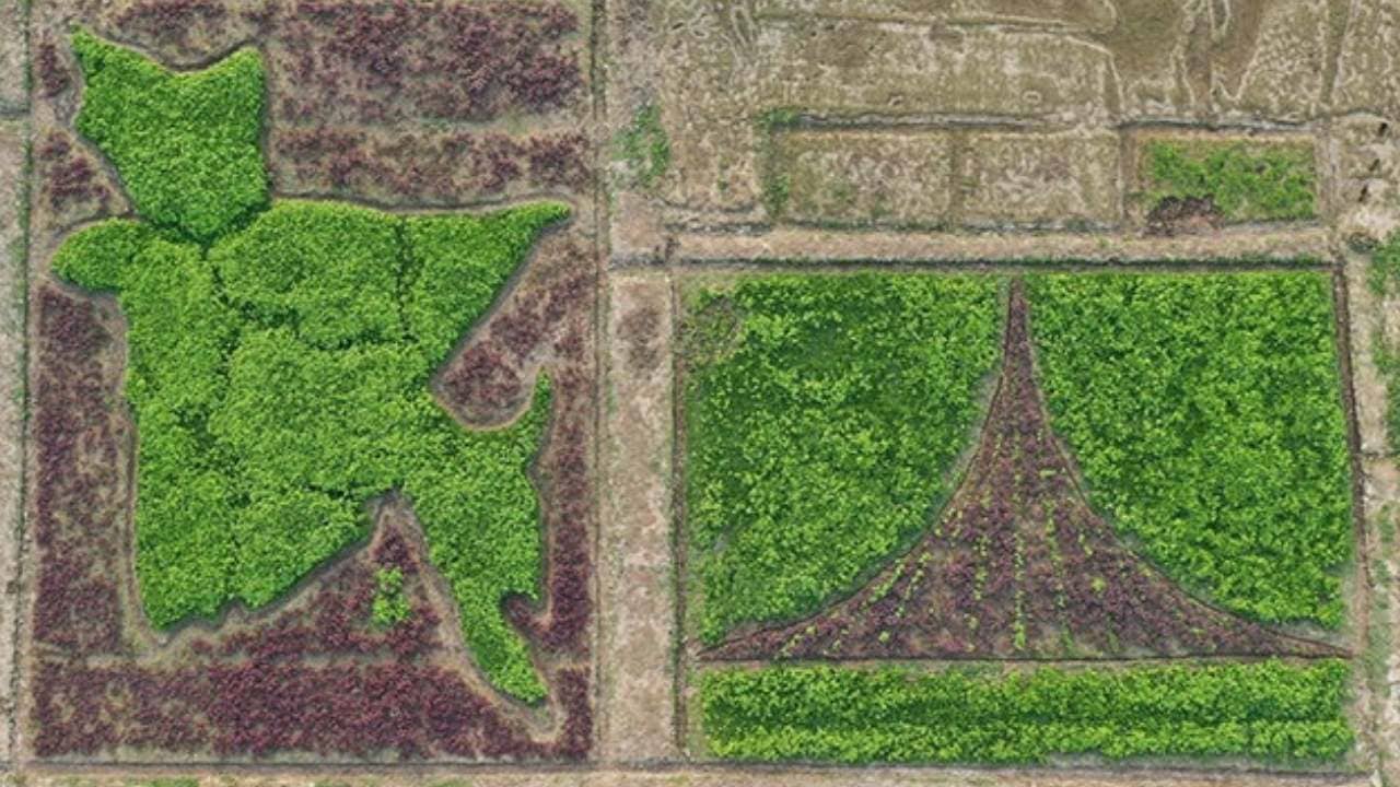 ঢাকা: চারিদিক সবুজে সবুজ। যে দিকে তাকানো যাবে দেখা যাবে ধানক্ষেত, সব্জির মাঠ। কিন্তু যদি উপর থেকে এই ধানক্ষেতের দিকে লক্ষ্য করা যায় তাহলে দেখা যাবে বাংলাদেশের মানচিত্র এবং স্মৃতিসৌধ। স্বাধীনতা দিবসে বাংলাদেশকে শ্রদ্ধা জানাতে এই কাজ করা হয়েছে। বাংলাদেশের শেরপুর জেলায় এ ভাবেই চাষ করা হয়েছে। ধানের ক্ষেত এমন ভাবে করা হয়েছে যা বাংলাদেশের মানচিত্রের আকার নিয়েছে। ড্রোনের সাহায্যে সেই ছবি তোলা হয়েছে। যা এখন ভাইরাল সোশ্যাল মিডিয়ায়। ২৬ মার্চ, রবিবার বাংলাদেশের স্বাধীনতা দিবস। ১৯৭১ সালের এ দিনে পরাধীনতার শৃঙ্খল ভেঙে পাকিস্তানের অত্যাচার থেকে মুক্তি লাভ করে পূ্র্ব বাংলা। জন্ম নেয় বাংলাদেশ। স্বাধীনতা দিবস উদযাপনেই শেরপুরের কৃষি প্রশিক্ষণ ইনস্টিটিউটের শিক্ষার্থীরা চাষের জমিতে বাংলাদেশের মানচিত্র তৈরি করেছেন।