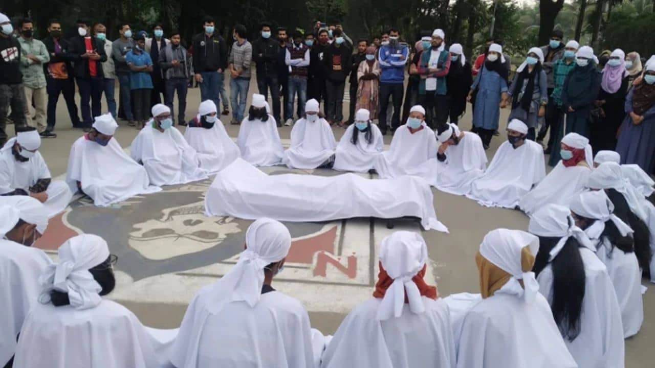 সিলেট: বাংলাদেশের শাহজাহানলাল বিজ্ঞান ও প্রযুক্তি বিশ্ববিদ্যালয়ে ছাত্র বিক্ষোভের ঘটনা ক্রমেই বড় আকার ধারণ করছে। বিগত বেশ কয়েকদিন ধরেই উপাচার্য ফরিদ উদ্দিন আহমেদের পদত্যাগের দাবিতে আমরণ অনশন কর্মসূচি পালন করছেন শিক্ষার্থীরা। শনিবার অভিনবভাবে বিক্ষোভে সামিল হল বিশ্ববিদ্যালয়ের ছাত্রছাত্রীরা। কাফনের সাদা কাপড় পরে বিশ্ববিদ্যালয় ক্যাম্পাসে মৌন মিছিল করেন পড়ুয়ারা। মিছিলের সামনে ছিল একটি প্রতকী মৃতদেহ। পড়ুয়াদের এই ধরনের প্রতিবাদ দেখে অনেকেই অবাক হয়ে গিয়েছেন।
