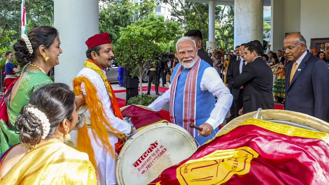 When Maharashtra’s enthu, culture & festive vibes are felt in Singapore too, Hon PM Narendra Modi ji joins it, plays the Dhol perfectly, without missing a single beat !@narendramodi#NarendraModi #Singapore #GanpatiBappaMorya pic.twitter.com/z96MMH7dOq