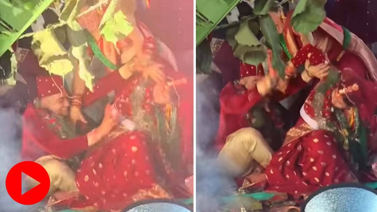 ওই ভাইরাল ভিডিয়োয় দেখা যাচ্ছে, বিয়ের সাজে সেজেছেন যুবক-যুবতী। বিয়ের মণ্ডপে পাশাপাশি বসে রয়েছেন তাঁরা। চলছে বিয়ের অনুষ্ঠান। বিভিন্ন রীতি মেনে হচ্ছে বিয়ে। সেই বিয়েরই একটি রীতি ছিল বর এবং বউ একে অপরকে খাওয়াবেন। সেই মতো একে অপরকে খাওয়াতে উদ্যত হন তাঁরা। কিন্তু কে কাকে আগে খাওয়াতে পারেন- এই প্রতিযোগিতা করতে গিয়েই লড়াইয়ে জড়িয়ে পড়েন তাঁরা। এক প্রকার হাতাহাতি শুরু হয়ে যায় তাঁদের মধ্যে। তা করতে গিয়ে পিঁড়ি থেকে বর-কনে দু’জনই লুটিয়ে পড়েন মাটিতে। বিয়ের মণ্ডপে উপস্থিত অন্যান্য তা থামাতেও উদ্যত হন।